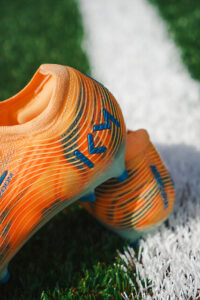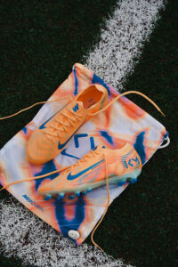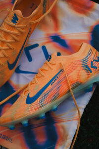 Dominantní tón Melon Tint (světlá broskvově oranžová) pokrývá celý pletený svršek Flyknit a dodává botě letní nádech a vizuální teplo. Kontrastní podrážka v odstínu Igloo přináší chladivou rovnováhu a svěžest, zatímco detaily v barvě Neo Turq – od Swooshe přes hroty kolíků až po Mbappého logo KM na patě – podtrhují dynamický charakter modelu.